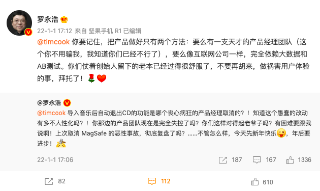 近日,锤子科技创始人罗永浩在社交平台@苹果 CEO 库克 timcook,发文吐槽称:“导入音乐后自动退出 CD 的功能是哪个丧心病狂的产品经理取消的?知道这个愚蠢的改动有多不人性化吗?你那边的产品团队现在是完全失控了吗?”。