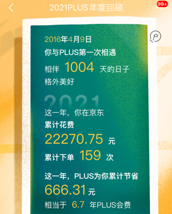 昨天,京东上线了 2021 PLUS 年度回顾页面,可查看 2021 年度累计花费和下单次数。在京东 App 搜索“年度回顾”即可进入该页面。