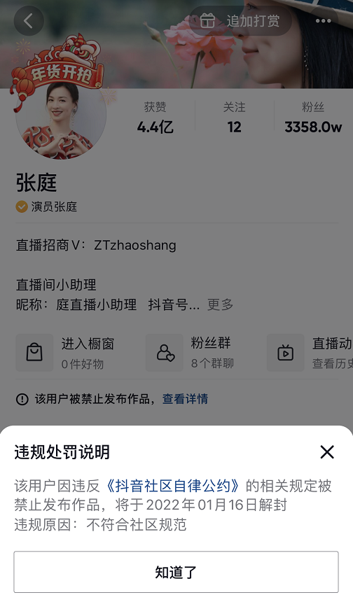 据了解,今天,演员、TST 庭秘密实控人张庭的抖音账号被禁止发布作品。违规处罚说明显示,原因为“不符合社区规范”,将于 2022 年 1 月 16 日解封。最新数据显示该账号粉丝超 3358 万,而 TST 庭秘密官方抖音号粉丝超过 214 万。此外,张庭、林瑞阳两人的账号和 TST 庭秘密微博均被禁言。