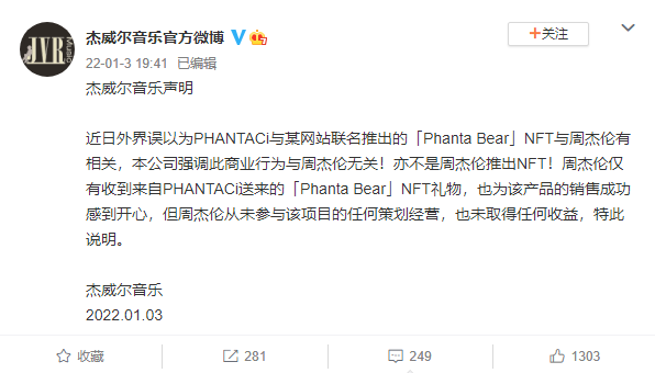 杰威尔音乐发布声明称:周杰伦仅有收到来自 PHANTACi 送来的「Phanta Bear」NFT 礼物,但周杰伦从未参与该项目的任何策划经营,也未取得任何收益。(来源:IT之家)