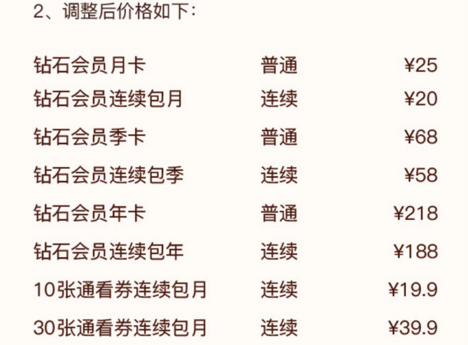 据悉,调整时间: 2022 年 2 月 1 日 0:00。其中,钻石会员月卡普通 25 元,连续包月 20 元;钻石会员季卡普通 68 元,连续包季 58 元;钻石会员年卡普通 128 元,连续包年 188 元等。