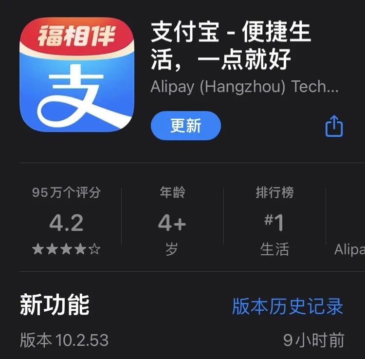 1 月 7 日消息,支付宝今天下午更新了 iOS 版 10.2.53,图标上新增福相伴字样。预示着 2022 年支付宝集五福即将开启。