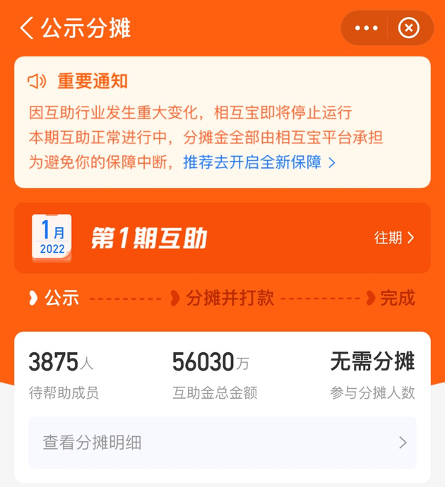 平台将承担关停前的3期分摊金。为避免成员保障中断,相互宝建议成员根据自身保障需求自主选择全新保障方案。(来源:新浪科技)