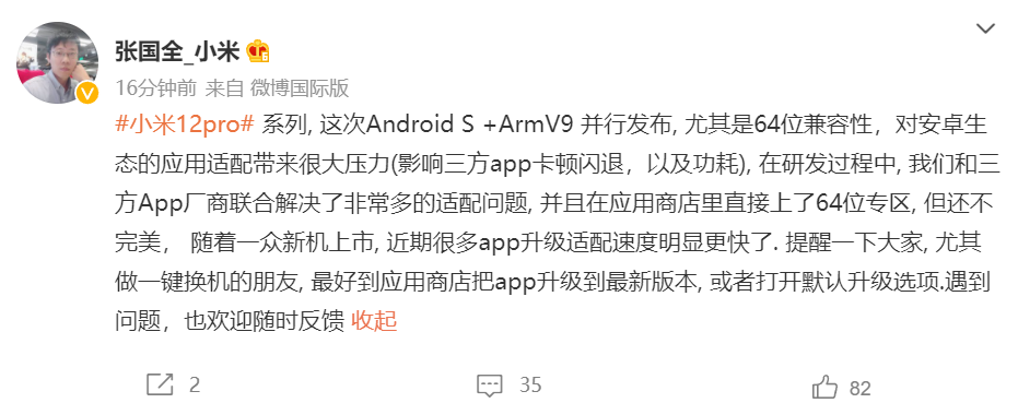 今日上午,小米手机系统软件部总监张国全在社交媒体表示,小米 12 Pro 系列 Android S +ArmV9 并行发布,尤其是 64 位兼容性,给安卓生态的应用适配带来很大压力,影响第三方 App 卡顿闪退以及功耗。