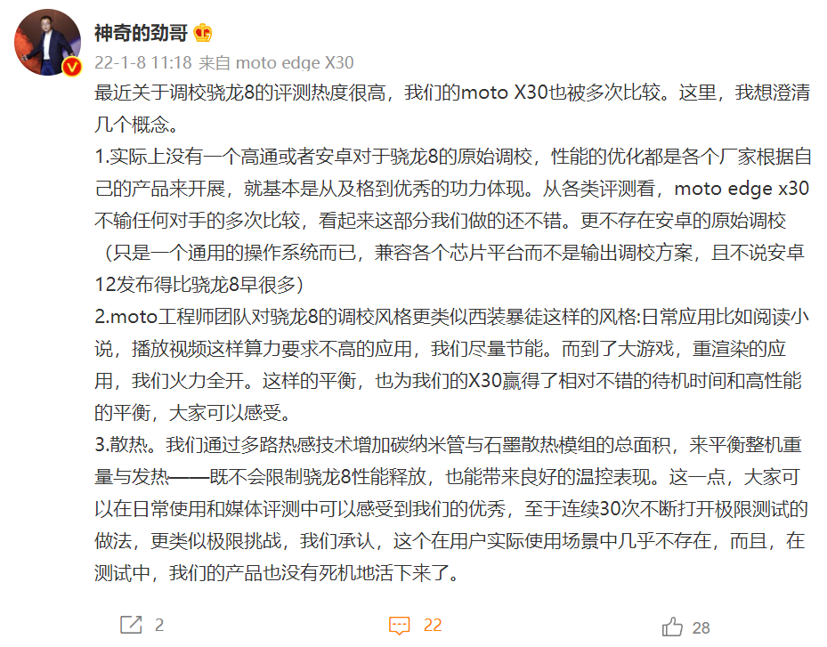 今日上午,针对“骁龙 8 调校”问题,联想中国区手机业务部总经理陈劲通过社交媒体表示,实际上没有一个高通或者安卓对于骁龙 8 的原始调校,性能优化都是各个厂家根据自己的产品来开展,基本是从及格到优秀的功力体现。“目前来看,moto edge X30 这部分做得还不错。”