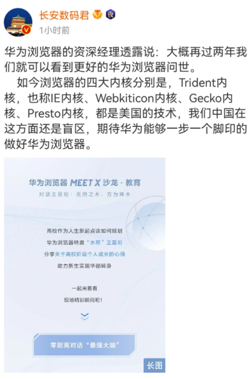 近日,据微博博主 @长安数码君 称,华为浏览器的资深经理透露说:大概再过两年我们就可以看到更好的华为浏览器问世。
