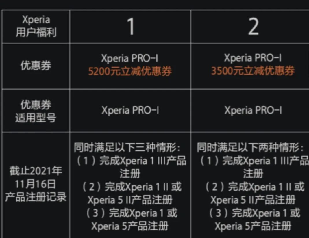 Xperia PRO-l 3500 元立减优惠券需同时满足两个条件:(1)完成 Xperia1 III 产品注册(2)完成 Xperia 1 III 或 Xperia 5 II 产品注册(3)完成 Xperia 1 或 Xperia 5 产品注册。(来源:IT之家)