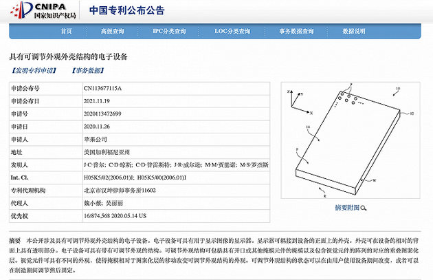 11月19日,苹果公司公布“具有可调节外观外壳结构的电子设备”专利。