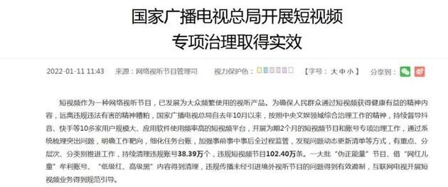 去年 10 月以来,有关部门持续督导抖音、快手等 10 多家用户规模大、应用软件使用频率高的短视频平台,开展为期 2 个月的短视频节目和账号专项治理工作。