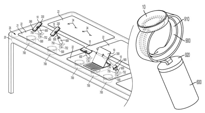 该专利涉及在 Apple Store 的大桌子上固定一个“固定器主体”和“展示杆”,这些桌子具有一个“固定器支架”来固定设备。某些设备可能具有连接到支架的可伸缩“固定缆线”,以提供电力并允许客户拿起设备。放置在显示杆顶部的磁铁可确保设备返回到预定位置。