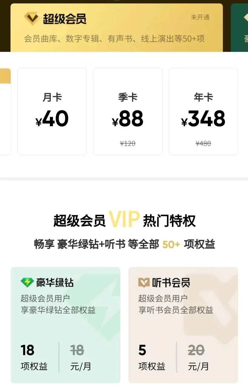 拥有豪华绿钻、听书会员、全民 K 歌等,并可免费畅听付费专辑,支持会员曲库、数字专辑、有声书、线上演出等 50 多项权益。目前升级为超级会员 15 元 / 月,连续包月 28 元 / 月,月卡 40 元,季卡 88 元,年卡 348 元。