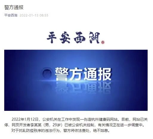 “平安西湖”微信公众号1月13日通报,2022年1月12日,公安机关在工作中发现一伪造杭州健康码网站。