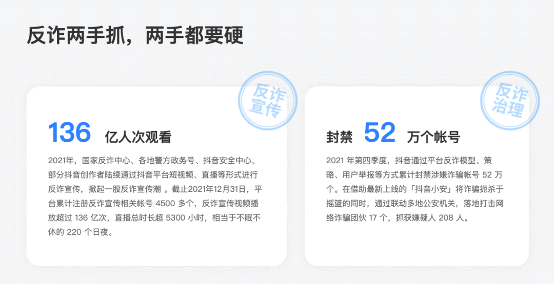 报告显示,2021年第四季度,抖音通过平台反诈模型、策略、用户举报等方式累计封禁涉嫌诈骗账号52万个,协助多地公安机关,打击网络诈骗团伙17个,抓获嫌疑人208人。(来源:新浪科技)