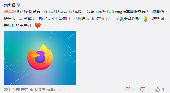 官方解释称:Firefox 浏览器下午无法访问网页的问题,是与 http/3 相关的 bug 被某些服务器的更新触发所导致,现已解决。(来源:IT之家)