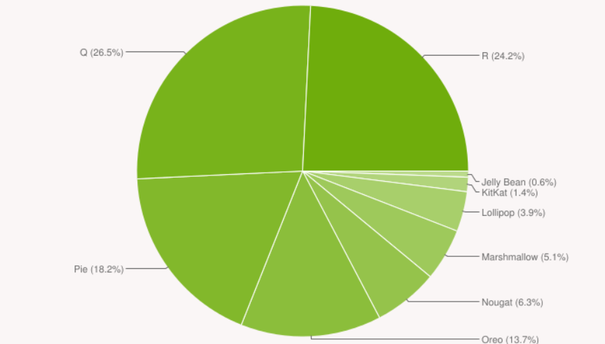 安卓 11(R)于 2020 年 9 月 8 日发布后,目前的份额为 24.2%,排名第二;2019 年发布的安卓 10(Q)则以 26.5% 的份额排名第一。
