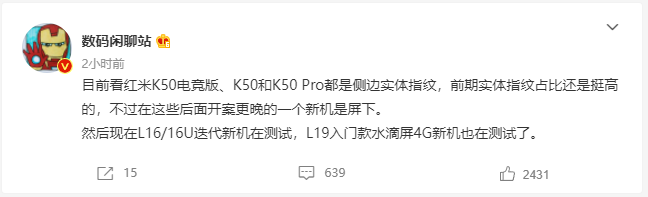 今天,微博博主@数码闲聊站 爆料,Redmi K50、Redmi K50 电竞版、Redmi K50 Pro 都将搭载侧边指纹解锁,与电源键二合一。同时代号 L16 和 L16U 迭代新机正在测试,还有 L19 这款入门款搭载水滴屏的 4G 新机在测试当中。