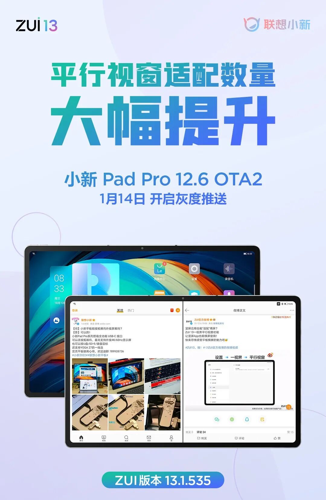 联想宣布,小新 Pad Pro 平板近期将再次推送 ZUI 12.6 系统 OTA2 更新,时间为 1 月 14 日至 1 月 21 日的特定时段。