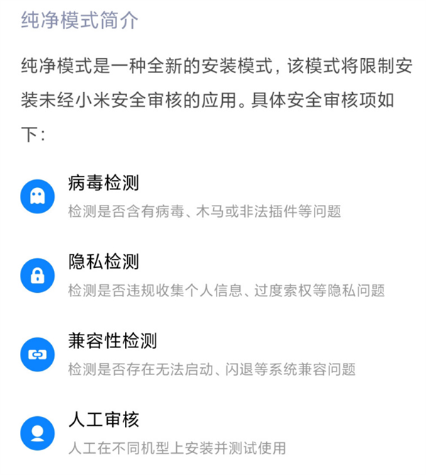 纯净模式是一种全新的安装模式, 该模式将限制安装未经小米安全审核的应用。具体安全审核项包括:病毒检测、隐私检测检测、兼容性检测检测、人工审核。