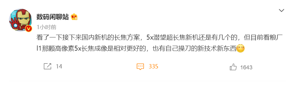 他表示,接下来有多款国产新机将采用 5 倍潜望式超长焦方案。目前来看,代号 L1 的小米 12 Ultra,搭载的高像素 5× 长焦成像相对更好。不仅如此,这款手机也有自己操刀的新技术、新东西,预计会配备小米自研芯片。
