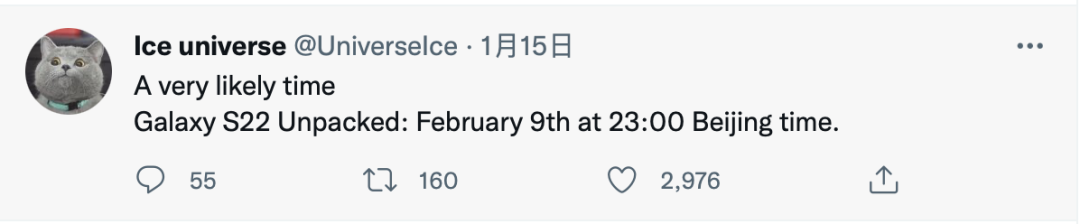 据 Ice universe 消息,三星 Galaxy S22 发布会可能在北京时间 2 月 9 日 23:00 举行。