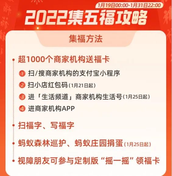 据悉,支付宝五福将于1月19日正式开启。据了解,今年最大的不同是五福全面向商家开放,1000多个商家将成为主角,通过自己的支付宝小程序、生活号、App等多个私域阵地为全国用户发福卡。