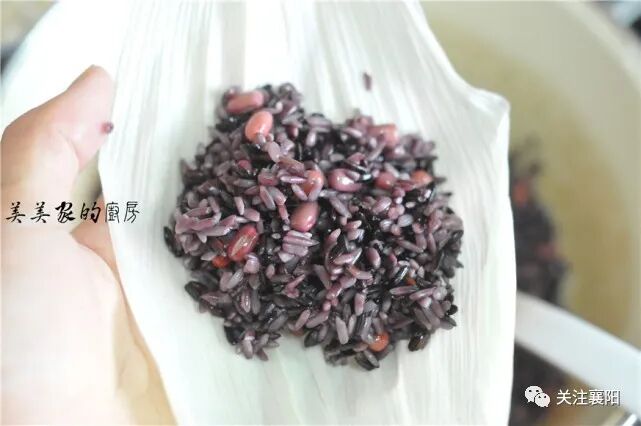 取一片玉米叶子,舀一勺杂粮放在玉米叶中间。