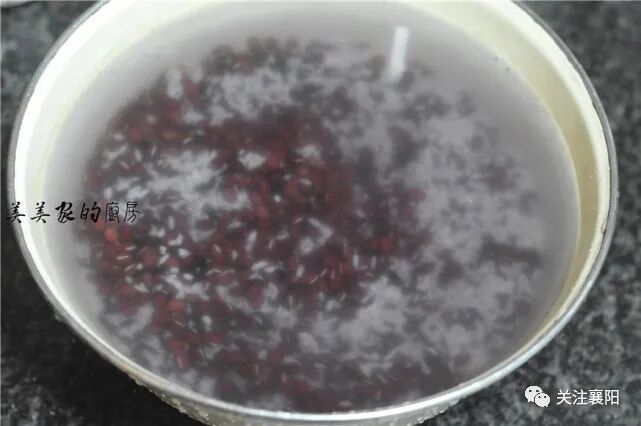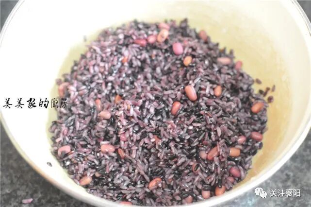 将紫米糯米和红豆都放入盆中,加入清水浸泡一个晚上。杂粮做点心,最好先充分浸泡,才能获得更好的口感。