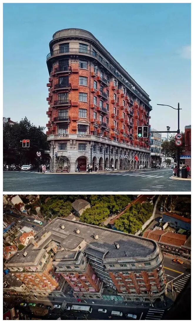武康大楼旧称诺曼底公寓,是为纪念法国的著名战舰“诺曼底号”而命名。1953年被上海市人民政府接管,更名为武康大楼。楼房设计有三角形古典山花窗楣、转角挑阳台、牛腿造型等多种法式元素。邬达克还把骑楼的概念放了进去,把公共橱窗退缩了进去,让当时中产阶级以上的市民能一边漫步一边可以看见橱窗里面的东西。