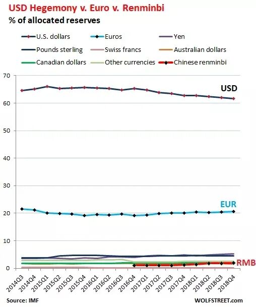 美元依然是占据主导地位的国际储备货币。欧元比美元如何?欧盟好不容易聚沙成塔,但欧元从科索沃战争时就已向美元缴械投降了。日元就更不用提了,美国那有点风吹草动,日元就崩了。比特币呢成为下个希望之星吗?能让钢铁侠几句话就上蹿下跳的比特币,怎么会是美元的“接班人”。黄金也不太可能,存量和年开采量太少,容不下现在国际贸易的体量。人民币呢,金融投资的系统还远不能支持,国际结算还是以美元系统为主。虽然中国商品是全球硬通货,但人民币还不是全球硬通货,现在就迎接货币战国时代,为时尚早。