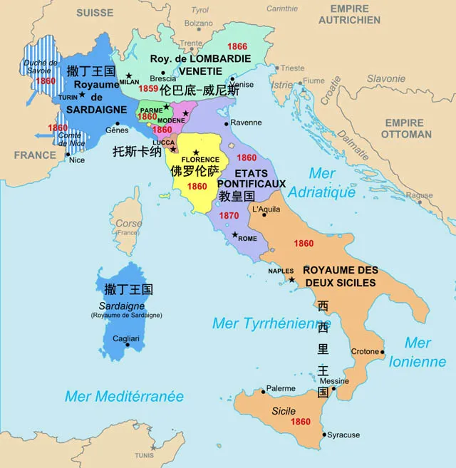 意大利资本主义的进一步发展,使统一成为其更加必要和迫切的要求。要达成目的,对外必须排除奥地利、法国等强国对统一的阻挠;对内必须消灭盘踞于意大利南方北方和西西里岛等地历史久远、根深蒂固的封建王朝,也必须消灭象征反动精神的教皇国,任务艰巨可想而知。