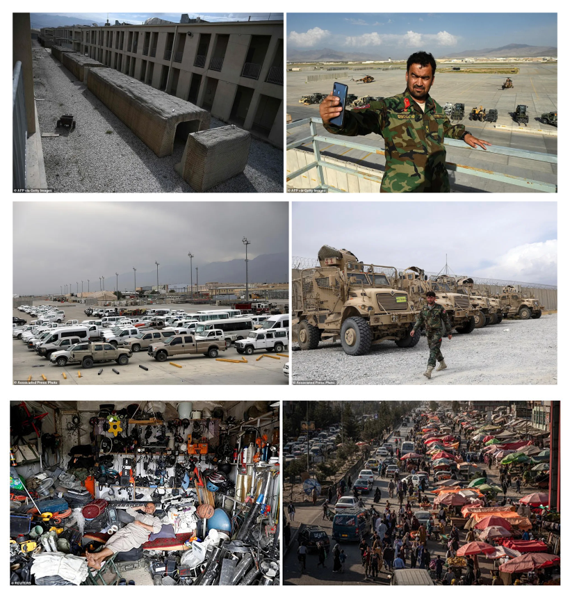 在一个月黑风高的周五,驻阿富汗美军在没有通知当地安全部队的情况下,拉了电闸,彻底离开了驻扎了20年的巴格拉姆空军基地。美军留下了350万件物品,包括水瓶,能量饮料,军用食品。大件物品有民用车辆,以及数百辆装甲车。数小时后,阿富汗当地街头,小商小贩就开始兜售各种美国大兵的“纪念品”:篮球、扬声器、笔记本电脑、自行车、头盔、电扇、吉他等。