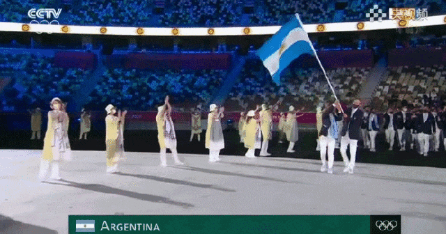 转圈圈型:来自阿根廷的两名旗手,以男旗手为圆心,以女旗手的脚步为半径,直接在场上挥舞着国旗来了个爱的魔力转圈圈。