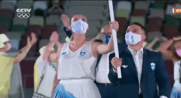 第一个入场的希腊旗手们就很吸睛。只见他们互不相让、僵持不下,甚至争夺中男旗手都跟着旗杆来回晃荡了...最终以女旗手霸气夺旗KO结束。