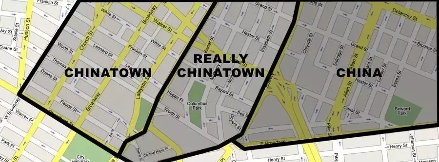 许多年前,漫步纽约网站上曾出现过一张地图,一个名叫Shawn的人将曼哈顿唐人街分为三个部分,分别叫华埠、正宗唐人街和中国城,引起过许多人的共鸣。