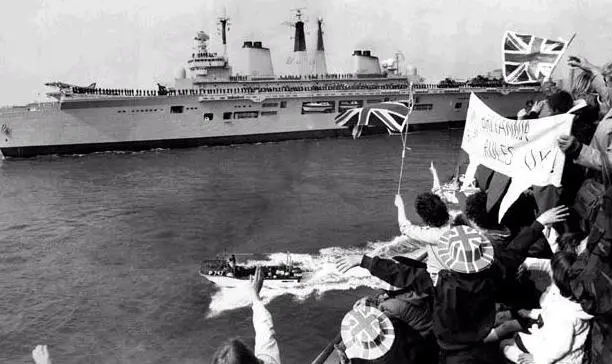 4月3日,英国政府宣布出兵。4月5日,由两艘航母、40余艘舰艇和部分征召的商船,载着4000人的海军陆战队、20架鹞式战斗机和45架直升机,组成的特混舰队离开了英国本土,直扑南大西洋上的马岛。