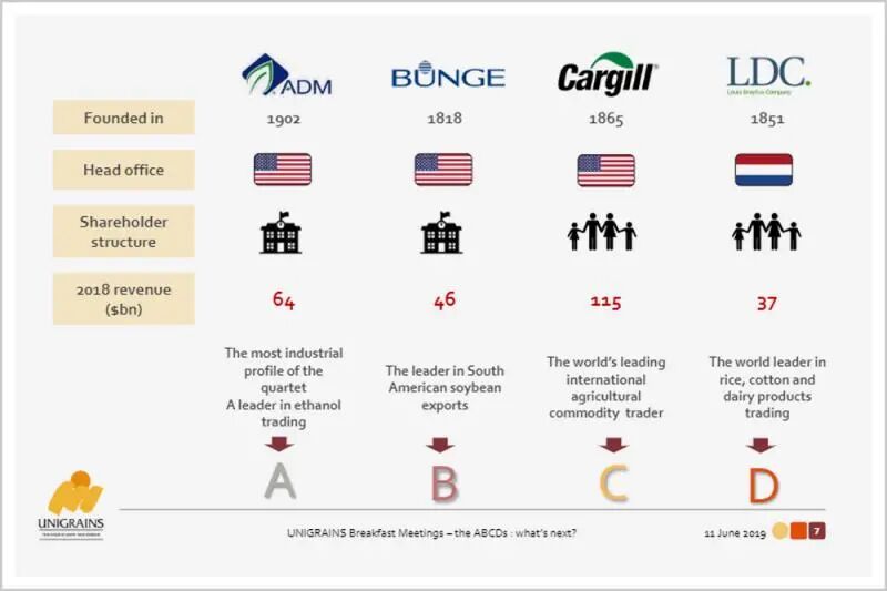 “D”指法国路易达孚(Louis Dreyfus),以期货买卖为主要,核心是注重农产品的期货买卖。