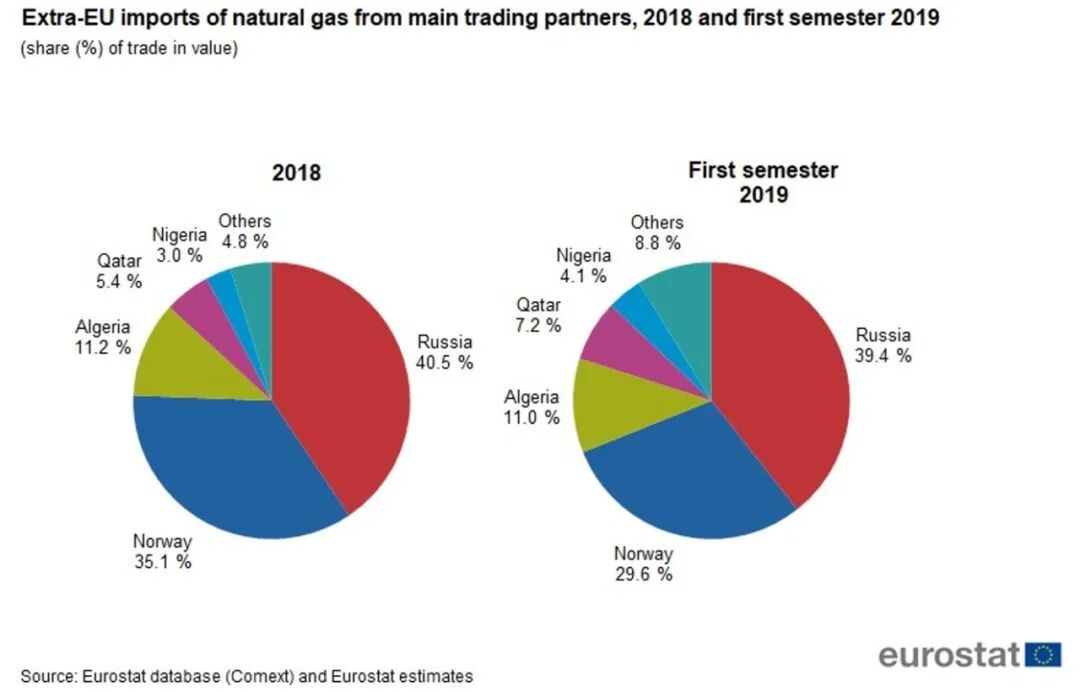 俄罗斯是全球天然气探明储量第一的国家。据欧盟统计局数据,2017年欧盟天然气进口总量的39%来自俄罗斯,2018年占比达40.5%,2019年上半年为39.4%。长期以来,俄罗斯出口商品构成中,资源能源类产品占65%-70%,而高技术和制造业产品为俄罗斯主要进口项目,也意味着俄罗斯经济被锢于资源能源的对外贸易。