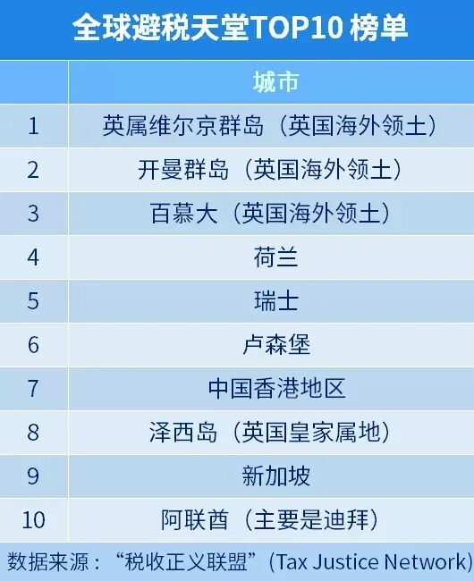 2021年3月9日,总部位于英国的调研机构“税收正义联盟”(Tax Justice Network)公布了最新的全球避税天堂排名。名单显示,英国下属的三个海外领土(英属维尔京群岛、开曼群岛、 百慕大群岛)占据了这份榜单的前三名,荷兰紧随其后为第四,瑞士第五,中国香港排名第7,阿联酋进入前10。据联合国估算,每年全球各国因跨国公司利润转移行为损失的税收达到 5000-6000 亿美元。