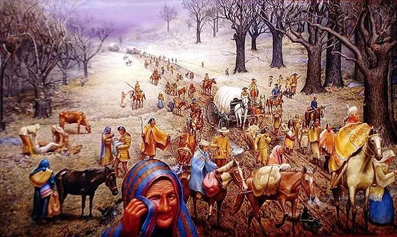 1830年,美国政府通过《印第安人迁移法案》,强迫东部的印第安人全部迁往,密西西比河以西为他们划定的保留地中去。这些“印第安人保留地”绝大部分是偏僻贫瘠的山地或沙漠地带。凭借这一政策,美国用西部山区十三万平方公里的土地,换取了印第安人四十万平方公里的土地,在一条条“血泪之路”(the trails of tears)上,成千上万人因饥寒或疾病死在半途。