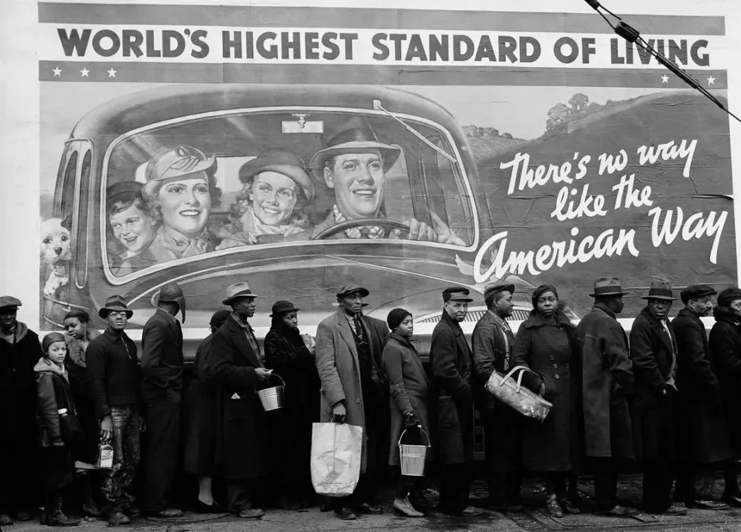 大萧条时期,工人的工资越来越低。在俄勒冈州,伐木工的工资每小时只有一毛钱;在康涅狄格州,服装厂的工人每周工资只有六毛钱;在芝加哥,一半以上的老师领的是政府白条,靠借高利贷维持生活。曼哈顿的出租车司机眼睁睁看着收入从每天7美元跌落到了不到3美元。但有工作已是幸运的了,夜间敲门讨饭的,可能是一年前在银行为你办理贷款的职员,或是某企业的高管。苏联驻美大使馆,每天都能收到几百份想要移民苏联的申请。