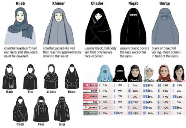 一、哈吉布 Hijab,covers hair and neck,即头巾,是用来遮盖头发,耳朵和脖子。