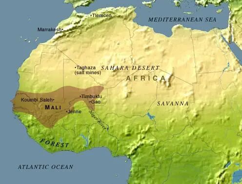 相对于灿烂辉煌的非洲古文明,西非地区的文明发展相对滞缓。公元4世纪左右,西非地区才逐渐兴起加纳、索宁克等小国;公元8世纪加纳帝国、塔克鲁尔、苏苏、约鲁巴小邦等国家崛起;公元13世纪到16世纪末这段时间里兴起的马里帝国、桑海帝国、豪萨城邦、朱洛夫、莫西、卡涅姆、贝宁等国家。而在这些国家中,尤其值得注意的是萨赫勒地区建立的王国,索宁克人建立的加纳帝国、曼丁哥人建立的马里帝国和桑海人建立的桑海帝国三大帝国。