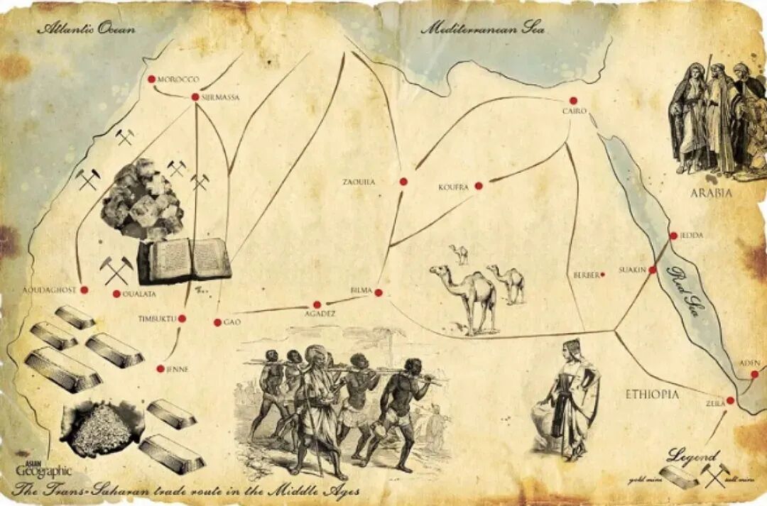 早在加纳王国兴起的时候,西非地区已经是欧亚黄金的主要供应地之一。西非地区还为地中海世界提供黄金、奴隶、乌梅、可可和象牙;西非各国需要产自撒哈拉沙漠中的毛里塔尼亚地区的食盐;地中海地区的陶器、玻璃、丝绸、油灯、珠宝、藏红花、枣椰、面粉等。而在当时,人类尚未开通从地中海到西非海岸的海上商路,只能穿过撒哈拉沙漠进行贸易。于是,跨撒哈拉沙漠的贸易圈形成了。
