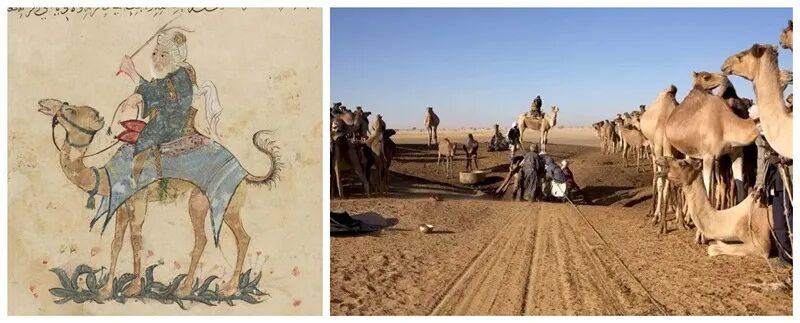 阿拉伯人从7世纪中叶起,将骆驼广泛用于贸易并从中获利。自8世纪起,大规模繁殖骆驼的成功,使得摩洛哥南部的德拉河流域成为盛产骆驼的基地,这也为大型骆驼商队穿越撒哈拉提供了必要的物质条件。在巅峰时期穿越撒哈拉的商路多达1400条,这种大型商队直到近代才被横跨非洲大陆的铁路运输打败。古代这些商队卖点什么呢?原料、奢侈品和特产,从最早加工石器用的黑曜石,到后来的贵金属,还有恒久不变的奴隶和盐。黄金在从南方地区转运过来后,会在撒哈拉沙漠的南缘或北缘的某个地方铸造成块,再运往地中海的港口。长期以来,黑人也被作为阿拉伯人的奴隶,自由买卖;在奴隶市场上,一个黑奴的价格,最多相当于三只山羊。北非国家进口奴隶作为家庭奴仆使用,西非国家则用于训练奴隶士兵。