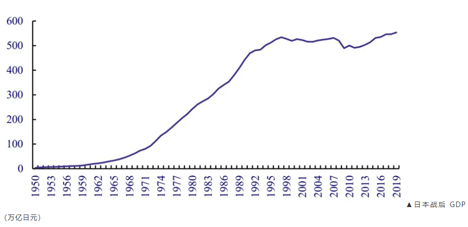 1950 年,日本 GDP 仅为 3.95 万亿日元。到了 1970 年,日本 GDP 已增长为 73.34 万亿日元,年均复合增长率达到 15.7%。日本成长为仅次于美国和苏联的“经济大国”。