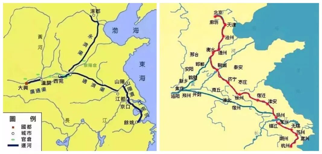 605年4月14日(隋大业元年三月二十一日)隋炀帝“命尚书右丞皇甫议发河南、淮北诸郡民,前后百余万,开通济渠”。605年,修通济渠,连通洛阳至今江苏淮安,同时疏浚山阳至江都的邗沟。608年,开凿永济渠,北通涿郡(今北京)。610年,修建江南河,直达钱塘江边的余杭(今杭州)。隋唐大运河经过洛阳,整体呈“之”字型。元朝郭守敬规划开凿会通河和通惠河,打通京杭大运河。今京杭大运河为了提高效率,对运河裁弯取直,大体呈南北直线型。