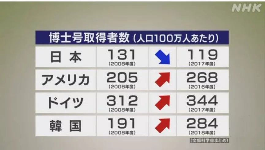 深度老龄化社会的日本,本来年轻人就少,留给年轻人专心做学术的岗位更是凤毛麟角。从日本大学教师的年龄来看,在1986年时,25—39岁的教师占比有40%,而到了2016年却下滑到只剩23.3%。日本国家电视台NHK也公布了一项数据,对比了日、美、德、韩四国每100万人的博士人数,日本排名倒数第一!