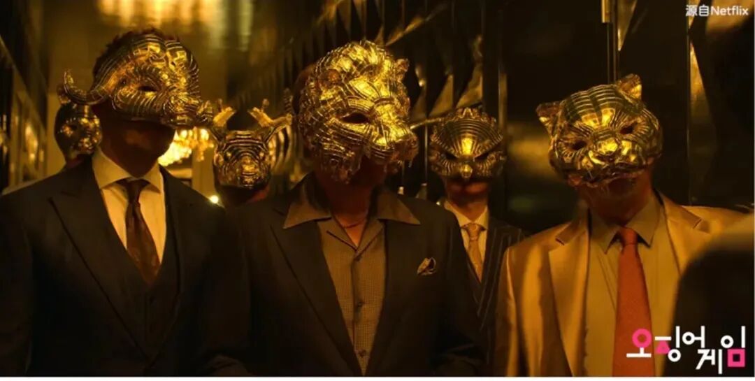从荧幕后走入现场的 VIP 贵宾看客们,一出场就带着兽头面具,用野兽之眼观赏这一场场死亡的游戏。失去人性的兽头人身,让人联想起撒旦化身——半人半羊。