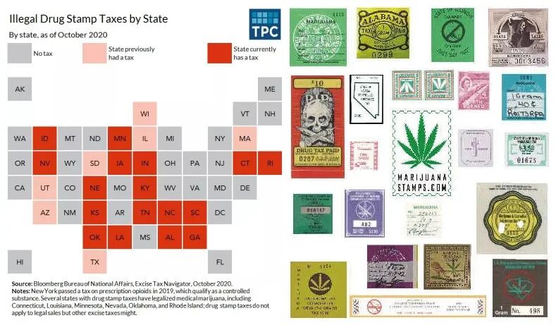 目前全美有17个州对非法毒品征税。毒品税法规定,每克大麻需要缴纳3.50美元,可卡因或海洛因每克要缴纳200美元。按照法规,毒贩需要在销售产品之前,用邮寄的方式向税务局为其产品缴税。根据美国第五修正案,犯人不可自证其罪。美国最高法院裁定,在毒品税的司法实践过程中,允许毒贩匿名报税。内布拉斯加州在颁发毒品税法30年里,发出过225张毒品税票。