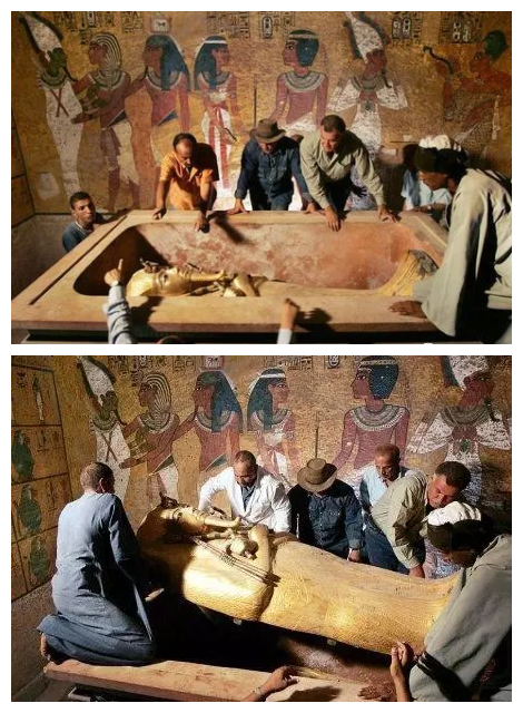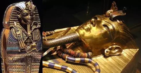 1923年的2月16日,卡特亲手打通了陵墓的最后一个墓室入口,他看到的是满室刺眼的金光。墓室一角安放着黄金打造的战车,除墓室外,所有的地方都放满了家具、器皿、箱匣等各类器物,其中包括墓主人的宝库。墓中的每件器物,都以金银珠玉装饰而成。在墓室中还发现了两尊真人大小的乌木镀金雕像,学者们认为这就是图坦卡蒙的形象。